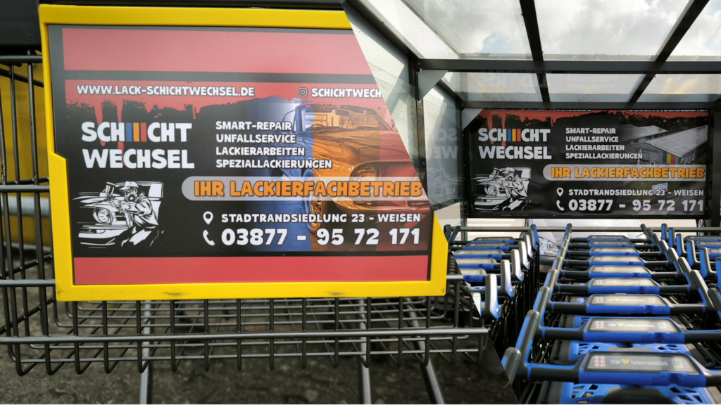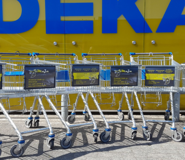 Dieser Unternehmensleitsatz gilt auch hier, damit Ihr Unternehmen die bestmögliche und langfristige Aufmerksamkeit erhält, bieten wir Ihnen als Premium- Partner die Kombination zu günstigen Konditionen an, sich auch neben den Einkaufs- Wagen - Komunikationsflächen im DIN A 4 Format unterschiedlich doppelseitg auch Großflächig aufzustellen.
